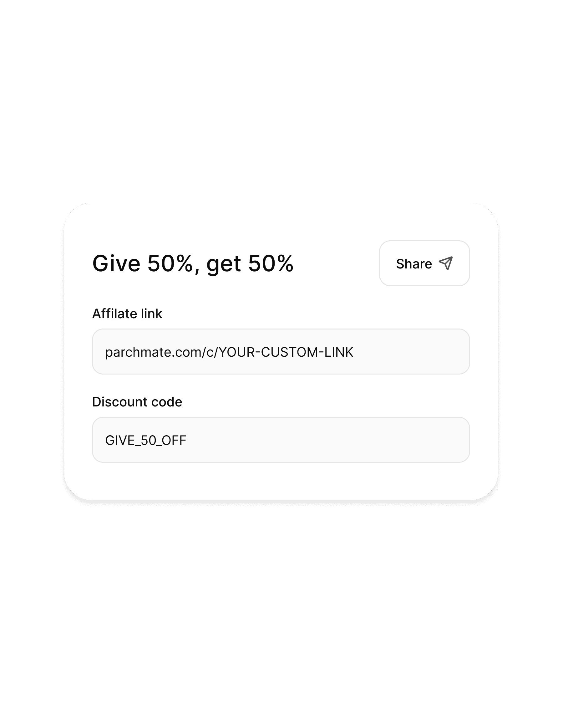 Your audience receives 50% off their first month when they join Parchmate using your custom discount code.